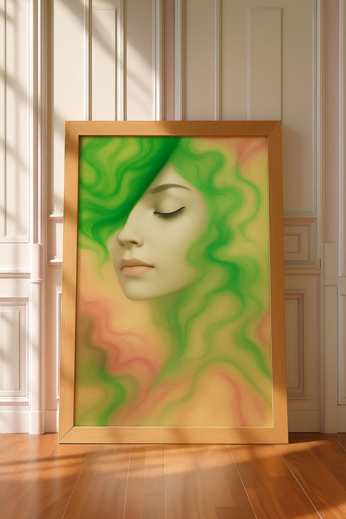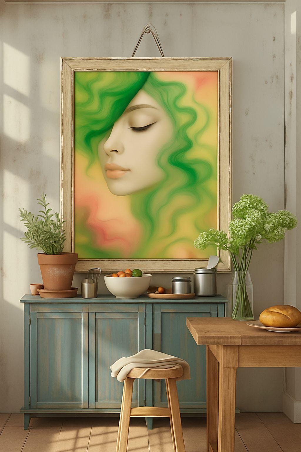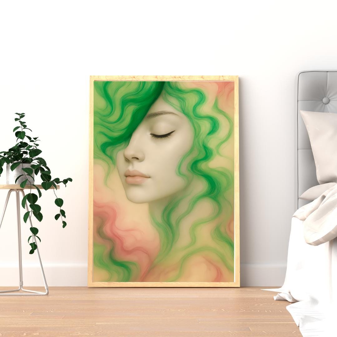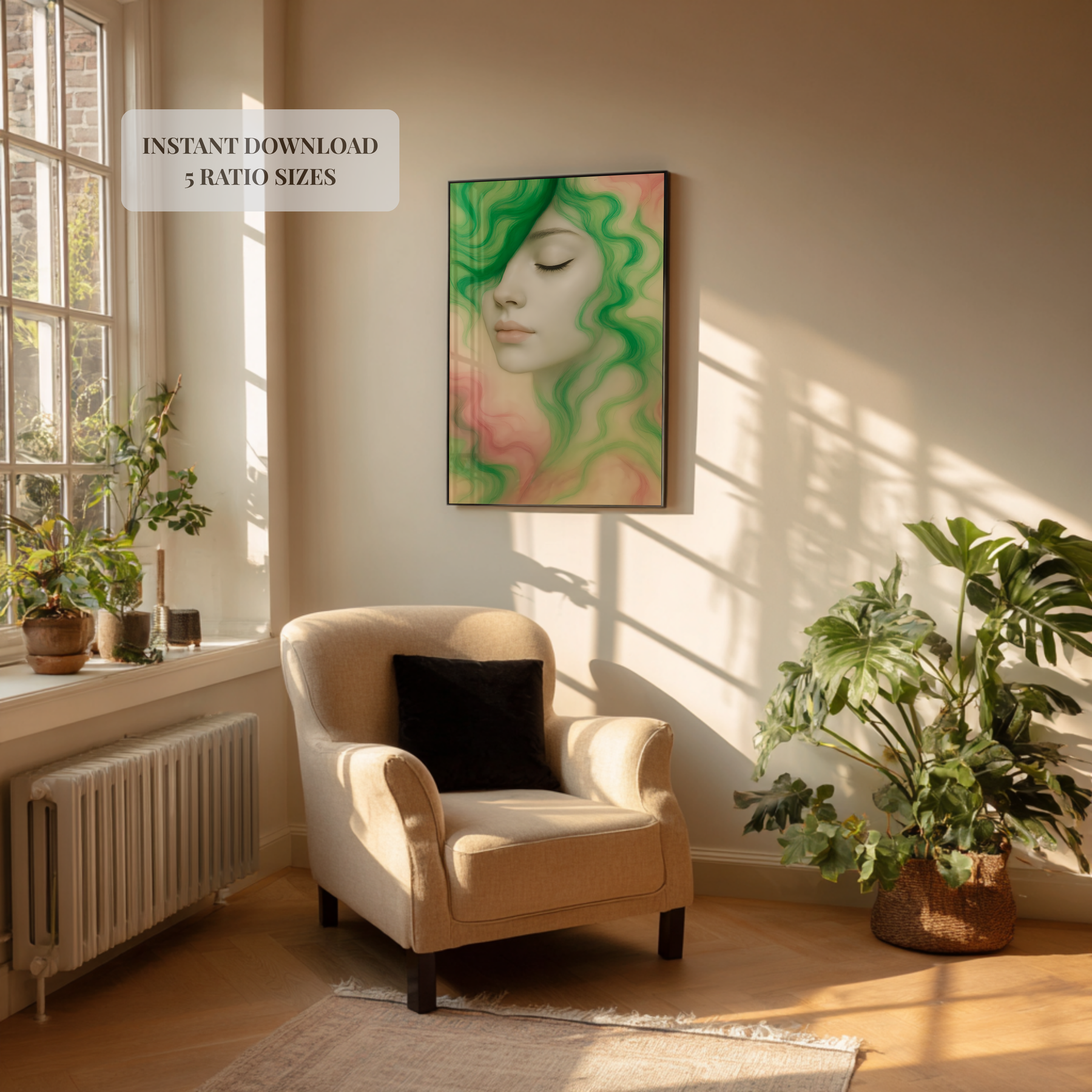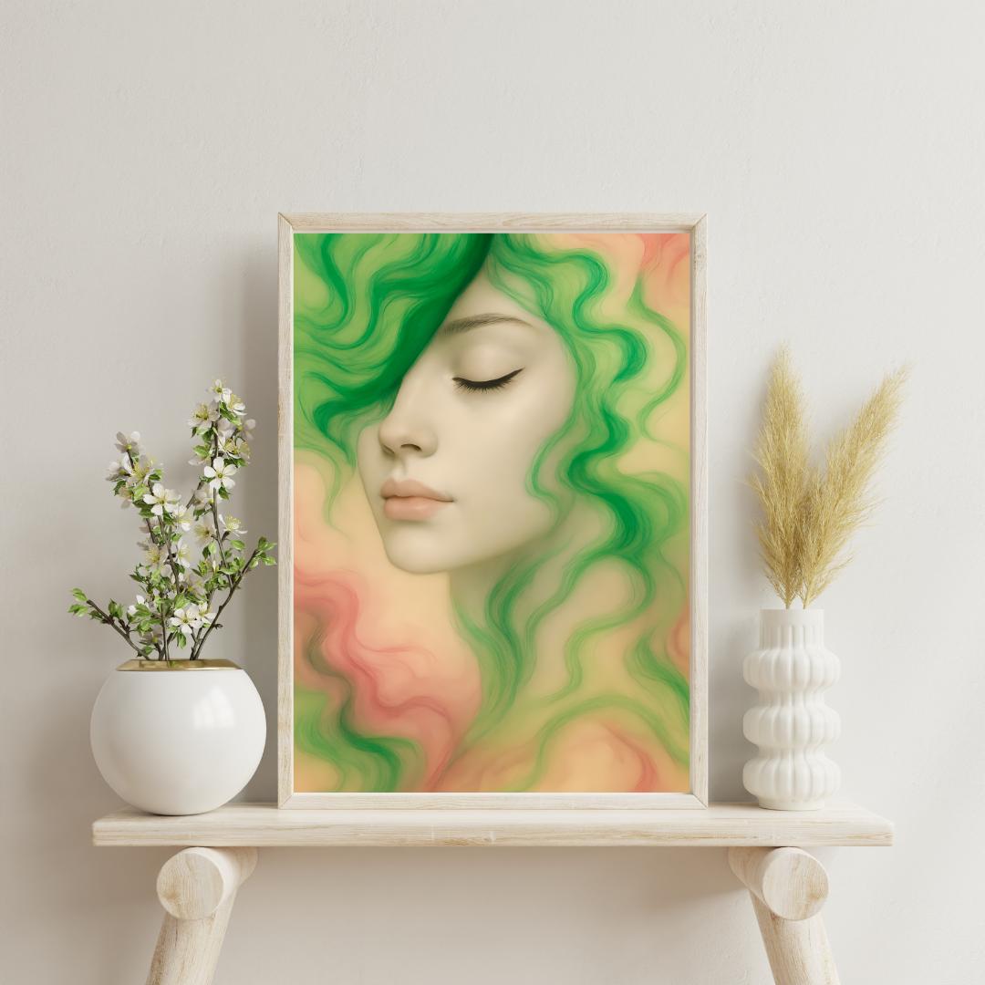 Add a touch of elegance and dreamy beauty to your home décor with this digital portrait wall art. Featuring a serene woman’s face with flowing pastel green and pink hair, this piece blends soft textures and delicate details to create a calming, ethereal atmosphere. Perfect for modern interiors, art lovers, or anyone looking to bring a unique and stylish accent into their space.