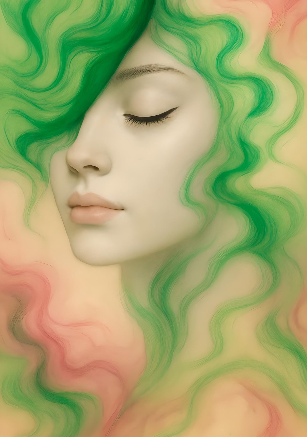 Ethereal Woman Portrait: Flowing Green Hair Pastel Ar...