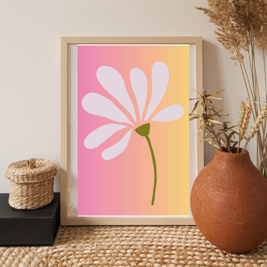 Embrace the beauty of simplicity with this captivating Minimalist Flower Art Print, an instant digital download designed to brighten any space. This unique piece features a delicate bloom with soft, flowing petals, elegantly set against a dreamy pink and yellow gradient background that evokes warmth and positivity.