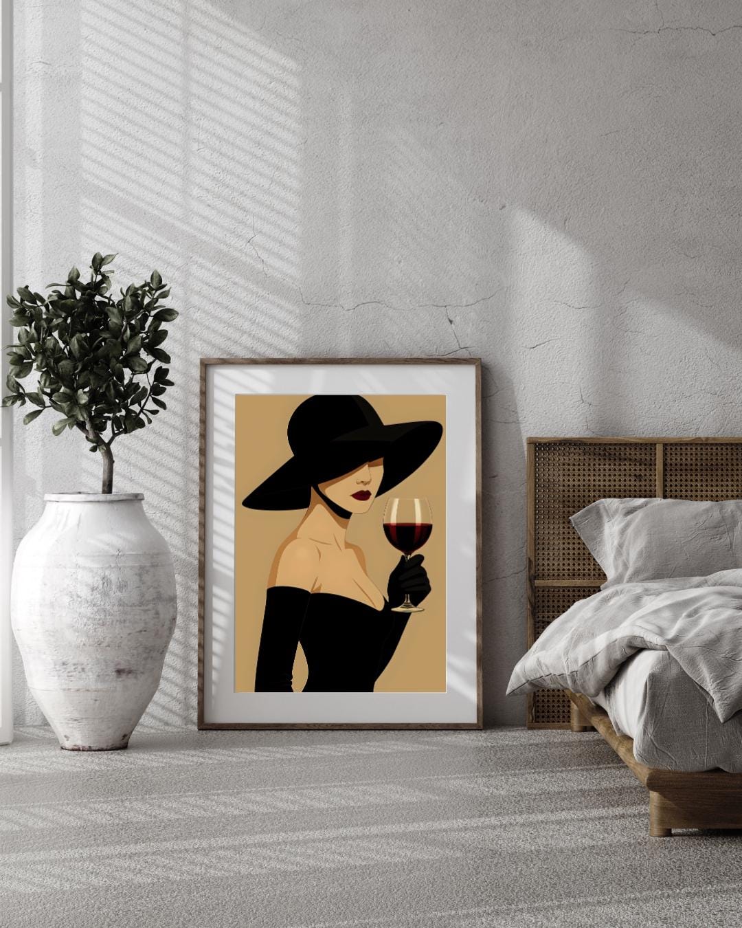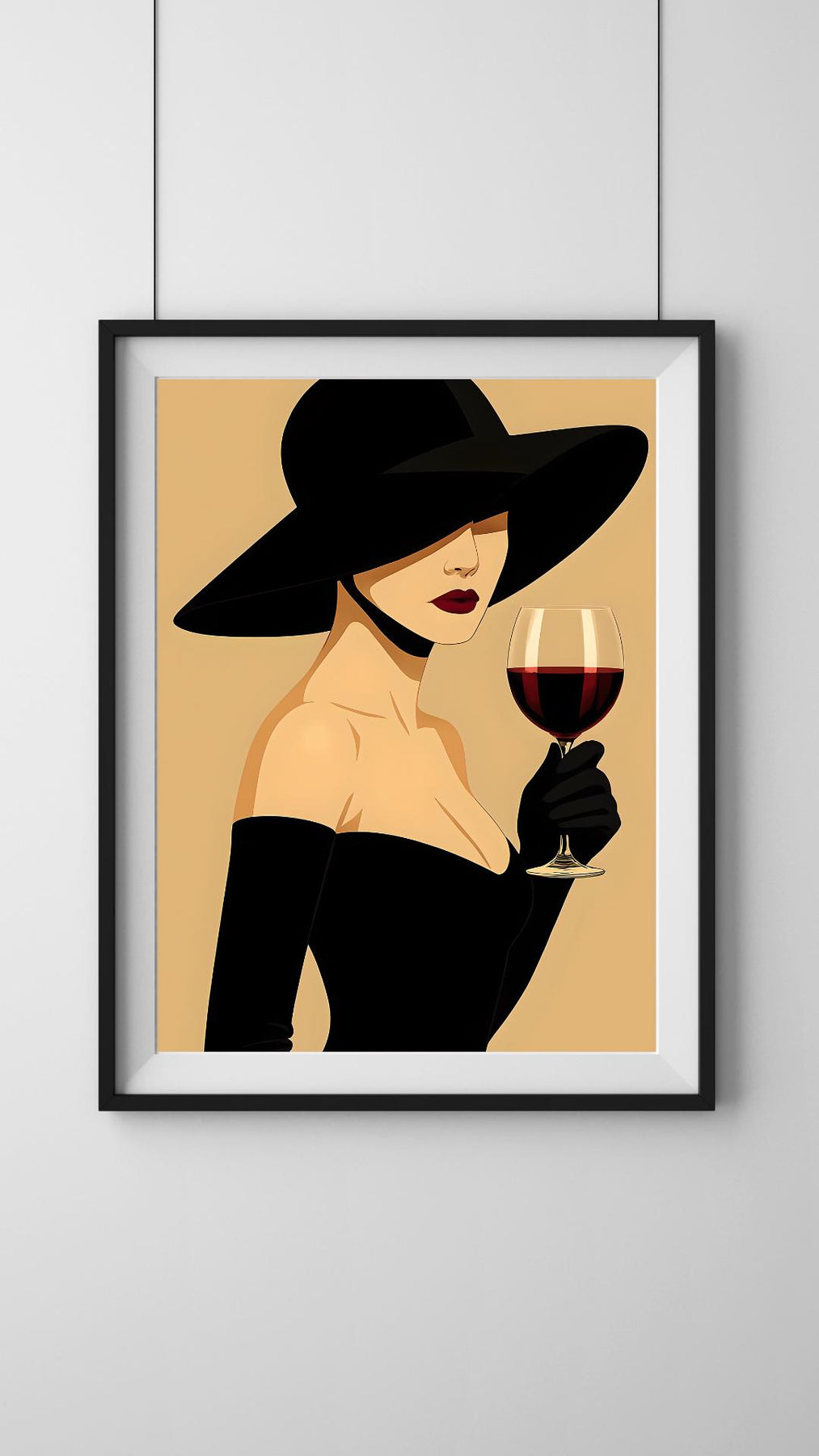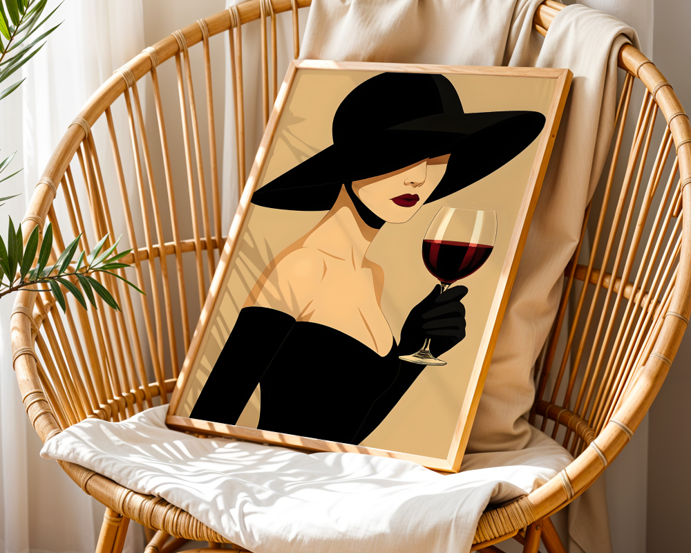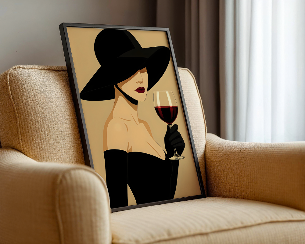 Elevate your space with this stunning digital art print featuring an elegant woman in a wide-brimmed hat, holding a glass of rich red wine. This chic and sophisticated illustration brings a touch of modern glamour to any room, perfect for creating a stylish gallery wall or adding a statement piece to your living area, bedroom, or office.
