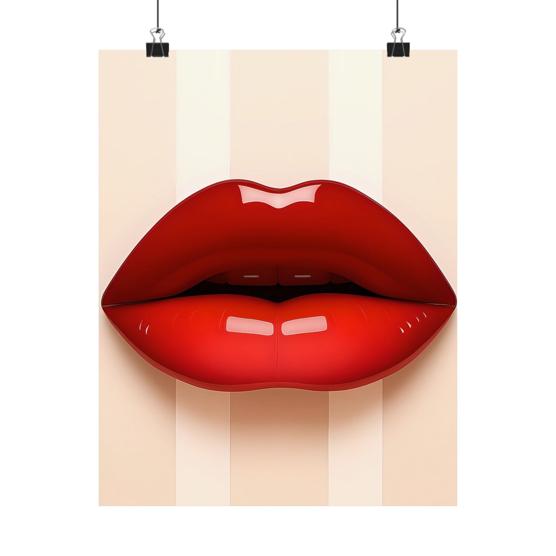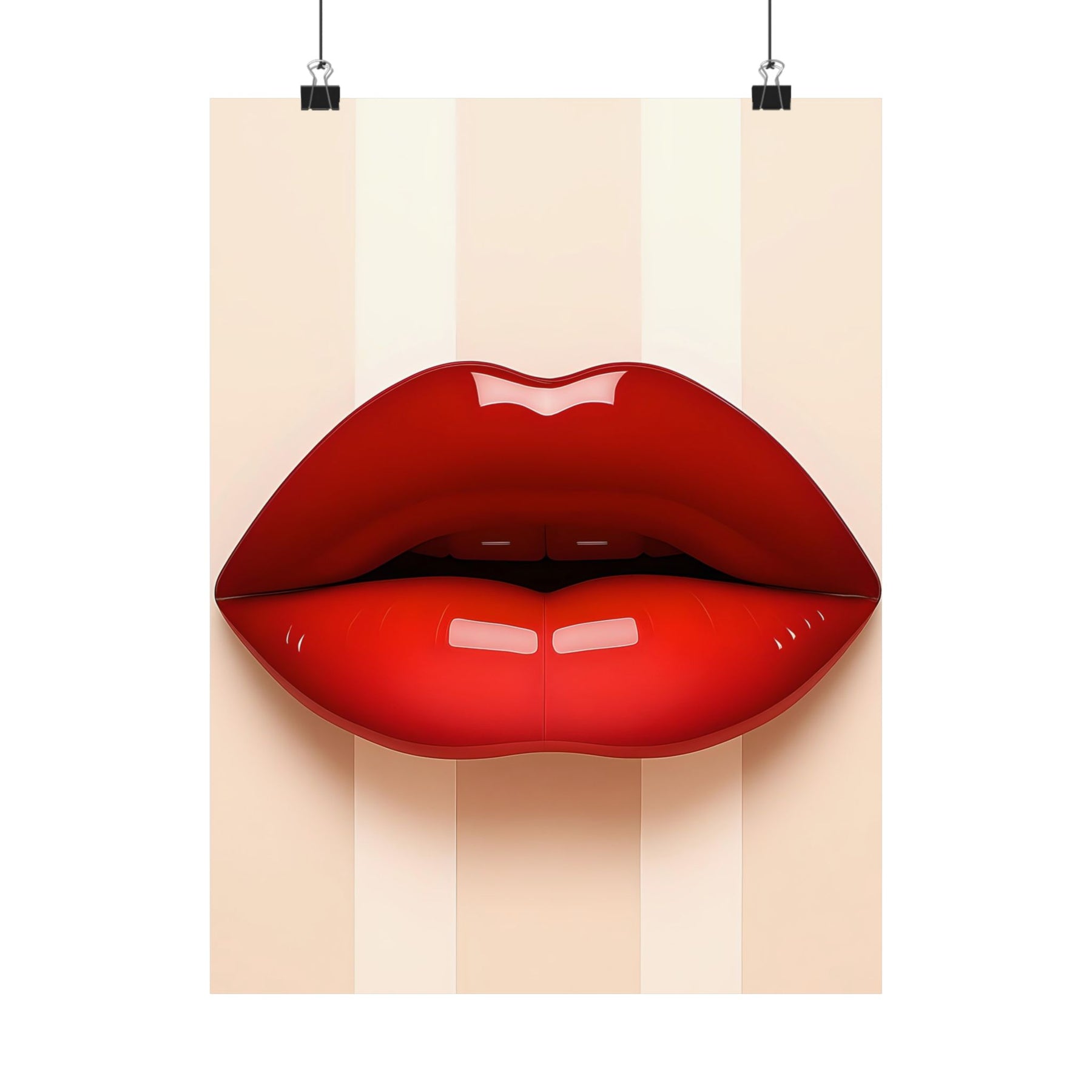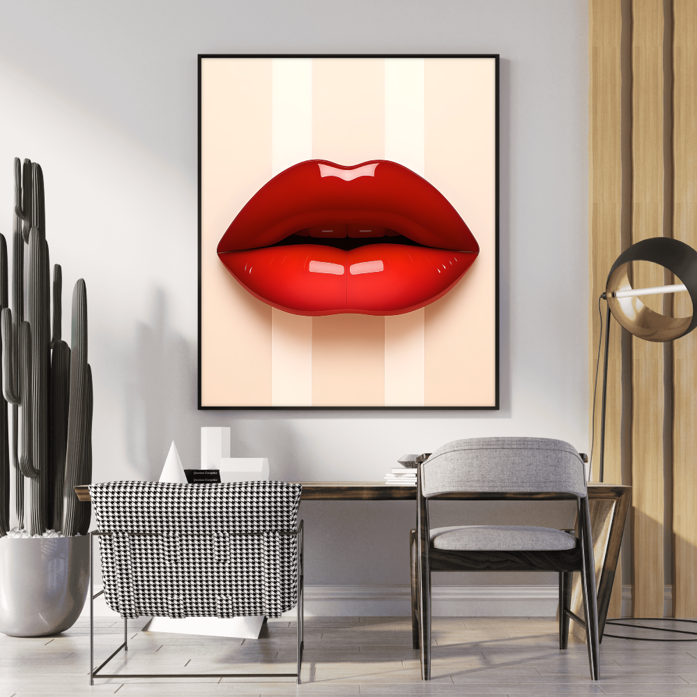 Bold, glossy red lips sit center stage on a soft, striped neutral background — a modern, artful poster that brings a splash of glamour to any room. Printed on museum‑grade archival paper with giclée inks, the matte surface soaks up light for a refined, painterly look while preserving vivid color and detail. Hang it in a dressing room, studio, or living space to add confident, pop-art energy. The design reads like a confident whisper: playful, stylish, and undeniably chic. Product features - Museum-grade archival paper for long-term color stability - Giclée printing for bright, fade-resistant color reproduction - Matte finish that reduces glare and offers a refined, light-absorbing look - Available in 46 sizes with slight size tolerance (+/- 1/16") - Intended for indoor display; sourced from USA, UK, and Japan Care instructions - If the print does gather any dust, you may wipe it off gently with a clean, dry cloth.