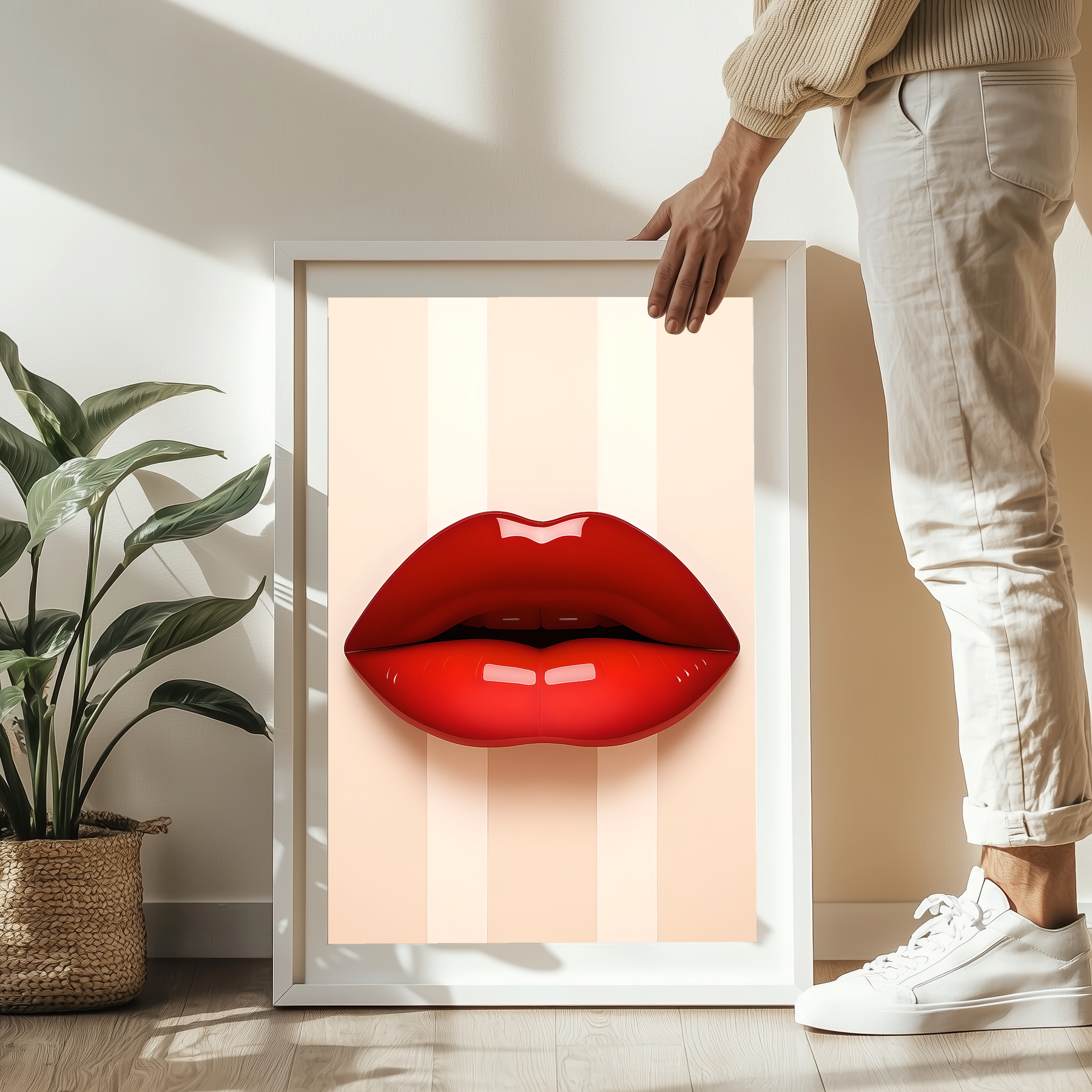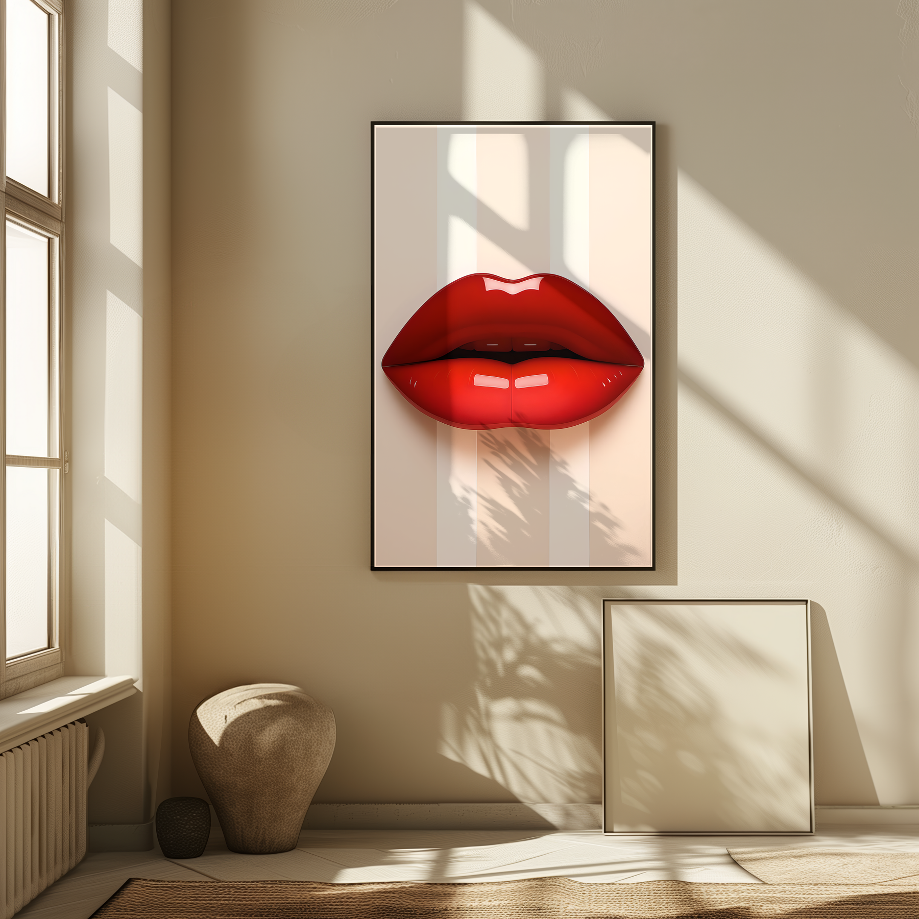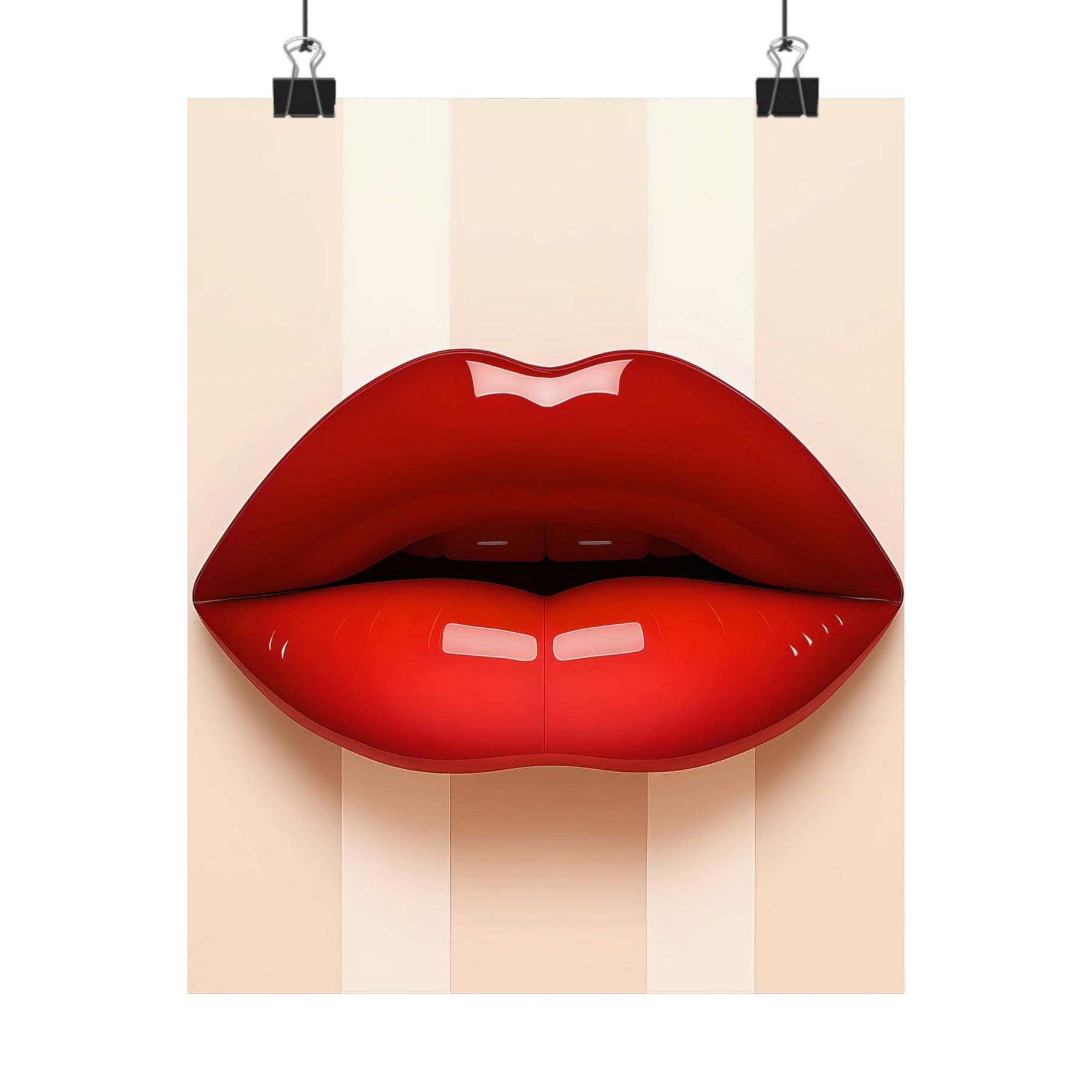 Bold, glossy red lips sit center stage on a soft, striped neutral background — a modern, artful poster that brings a splash of glamour to any room. Printed on museum‑grade archival paper with giclée inks, the matte surface soaks up light for a refined, painterly look while preserving vivid color and detail. Hang it in a dressing room, studio, or living space to add confident, pop-art energy. The design reads like a confident whisper: playful, stylish, and undeniably chic. Product features - Museum-grade archival paper for long-term color stability - Giclée printing for bright, fade-resistant color reproduction - Matte finish that reduces glare and offers a refined, light-absorbing look - Available in 46 sizes with slight size tolerance (+/- 1/16") - Intended for indoor display; sourced from USA, UK, and Japan Care instructions - If the print does gather any dust, you may wipe it off gently with a clean, dry cloth.